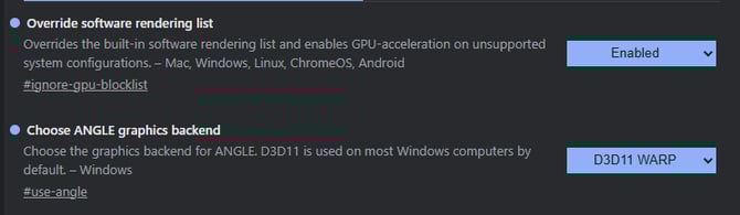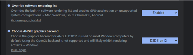 - If D3D11on12 doesn't resolve the issue, try changing the ANGLE Graphics Backend to OpenGL instead.